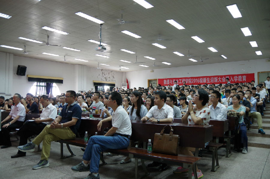 教师代表杨恢先教授用朴实却幽默的言语,告诫全体学生一定要珍惜大学时光,明确奋斗目标、搞好学习、强身健体,做到德、智、体、美全面发展。2015级物理学专业研究生陆冬林同学作为老生代表向学弟学妹们送来了祝福,并结合自己5年来在物理院学习、成长、成才的经历,鼓励大家放宽心、认真学,追求一份充实的大学生活,争做学院骄子。2016级微电子科学与工程一班本科生陈莹玉同学作为新生代表发言,她郑重承诺将牢记老师、学长的嘱咐,扎实学习,上好每一堂课,做好每一次笔记,过好大学生活的每一天。