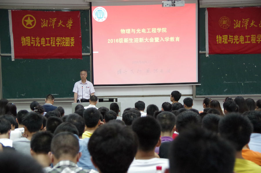 上午10:40,迎新大会准时开始。龙进良书记代表学院向2015级全体新同学致欢迎词,对新同学们披荆斩棘战胜高考来到湘大、来到物理院表示衷心的祝贺和热烈的欢迎。龙书记详细地介绍了365集团基本情况,从学院沿革、师资队伍、科研平台、学科建设、合作办学与学术交流等多个方面向新生展示了学院的风采与魅力,很好地树立了新生对学校、学院和专业的自信。