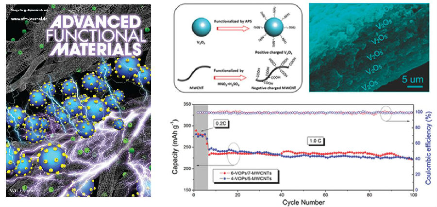 1. 随着目前动力电池需求的越来越高,对锂离子电池的大倍率充放电提出了更高的要求,而如何设计复合电极材料是提高锂离子电池快速度充放电的一个重要因素。黄凯副教授指导的孙彬研究生,通过对纳米材料表面进行修饰,使V2O5纳米颗粒表面带正电,MWCNTs表面带负电。利用静电相互吸引的原理,设计出独特的带正电V2O5纳米颗粒层与带负电的MWCNTs层交替的多层复合结构。V2O5纳米颗粒层被紧紧地限制在相邻的带负电的MWCNTs层间,提高了电极的整体性,解决V2O5纳米颗粒在锂离子电池充放电过程中体积的变化带来的循环稳定性差的问题。同时,MWCNTs层能很好地提高升V2O5材料的导电性,加速活性材料的氧化还原速度。从而很好地提高了V2O5电极材料的大倍率电流下的循环稳定性。本研究工作发表在Adv. Funct. Mater., 2015, 35, 5633-5639,并且被该编辑部选为本期封面。