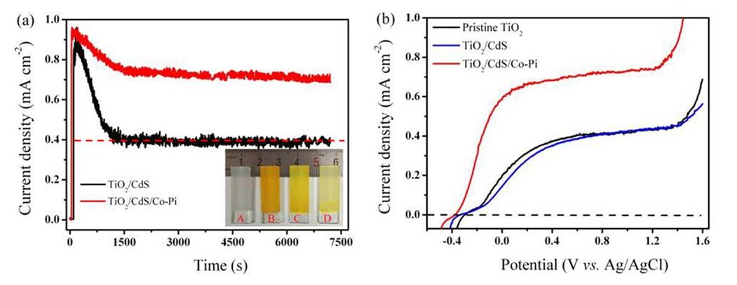图a和b中红色为Co-Pi/TiO2/CdS光电极的工作曲线,