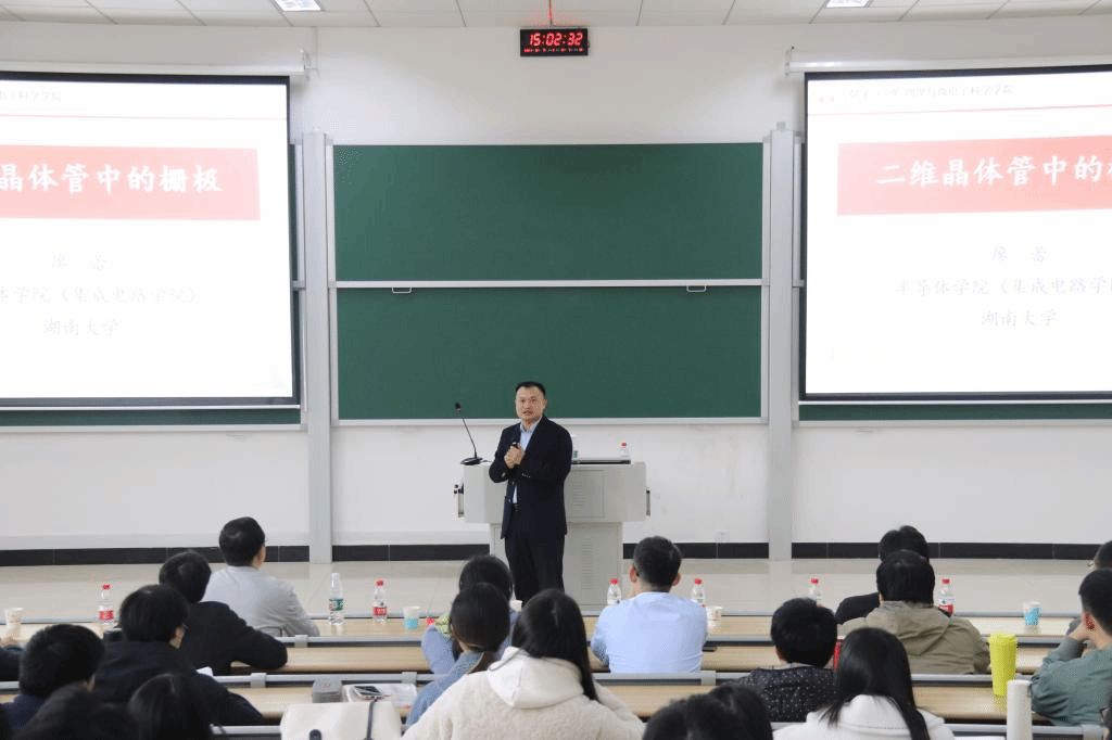 12月7日下午3时,韶风名家论坛在研究生院研二阶梯教室隆重举行。湖南大学二级教授、博导、校学术委员会委员、微纳光电器件与应用教育部重点实验室主任、半导体学院(集成电路学院)院长廖蕾教授作“二维半导体晶体管”主题分享。大会由英国365集团公司官网副院长毛宇亮教授主持。英国365集团公司官网院长钟建新教授等领导、科研骨干、青年教师和研究生参会。会议还吸引了部分理工科学院的师生前来参会。