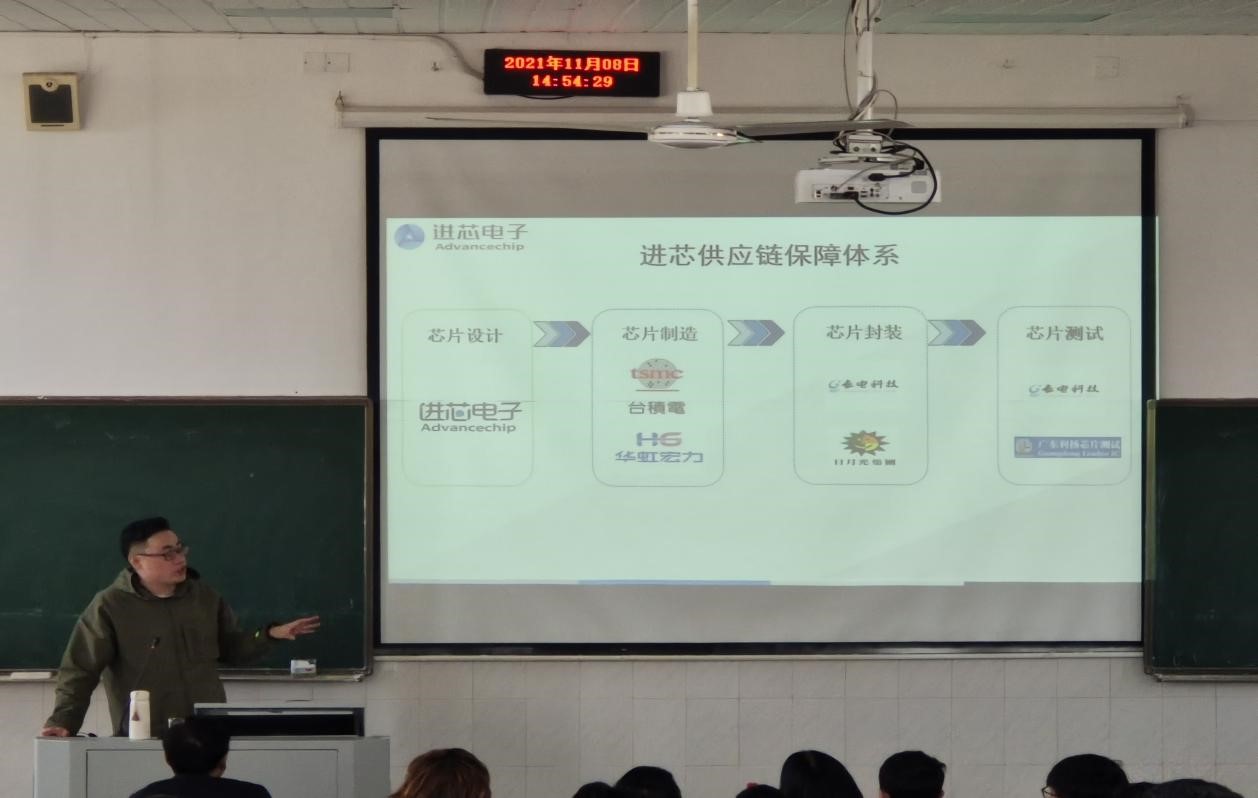 湖南进芯电子公司的张巍设计师通过行业价值链、芯片生产流程等内容的介绍,引出了比赛应用芯片及功能的解读。他鼓励同学们说道:“我国在芯片设计及制造领域仍处于奋起直追的阶段,作为未来科技工作者的我们,肩上都有一份责任,要为突破欧美技术封锁,解决‘卡脖子’问题奉献自己的力量”。
