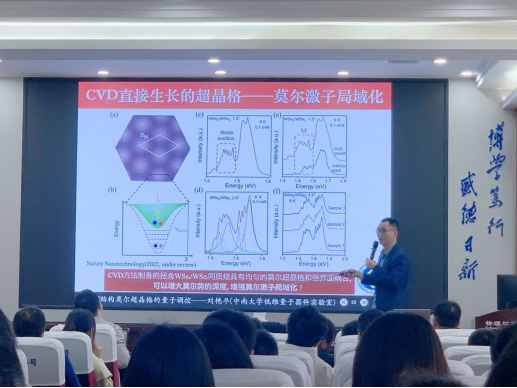 刘艳平教授从强关联材料的研究背景出发,分析了以往研究中强关联材料难以实现的困境,进而引出了今天论坛的主角:过渡金属二硫化物摩尔超晶格。这种材料具有相当大的带隙与强的自旋轨道耦合,同时在大范围的扭曲角上存在平带(即强关联),因此在实验制备以及利用转角进行调控等方面具有天然优势。刘教授从应用挑战、实验制备和量子调控三个方面分享了自己的研究成果,他们研究发现,施加压力、应变、磁场等可以实现对层内激子、莫尔势的调控,从而产生莫尔量子点、莫特绝缘态等新奇现象。最后刘教授分析了摩尔超晶格在量子计算、量子通讯等领域的潜在应用,对其应用前景进行了展望。