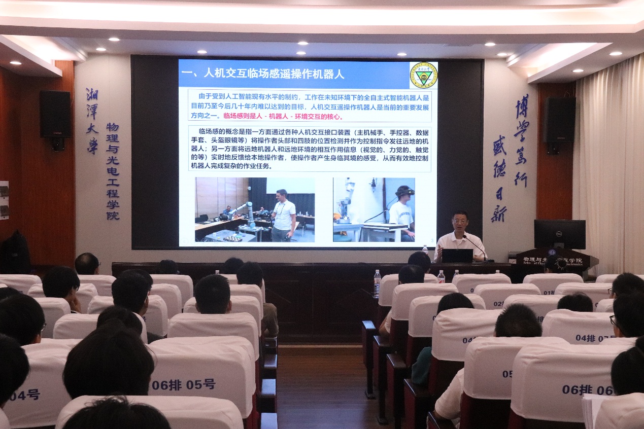 宋爱国教授围绕力觉临场遥感操作机器人技术研发,从人机交互临场遥感操作机器人、力觉临场遥感操作机器人的关键技术、研究进展以及应用情况四个方面展开介绍。“深空探测、载人航天、原子能利用、助老助残康复是人与机器人之间传感与控制信息交互重点发展的核心技术”宋爱国教授说,他向大家详细介绍了空间舱内机器人遥感操作的原理、困难以及机械臂人机交互遥感操作做的基本原理,并列举了美国NASA研制的IPL机器人、力反馈人力放大机器人、力反馈遥操作挖掘机、力反馈遥操作手术机器人等具体实例,引经据典,讲解通俗生动。
