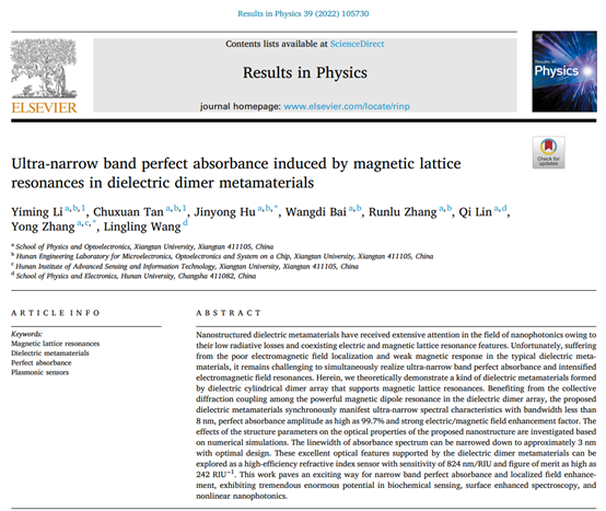 日,365集团2018级微电子科学与工程专业本科生李一鸣同学以第一作者身份(排名第一)在《Results in Physics》期刊上(JCR一区,IF4.476)发表研究成果:“Ultra-narrow band perfect absorbance induced by magnetic lattice resonances in dielectric dimer metamaterials” (Results in Physics, 39, 105730, 2022)。《Results in Physics》期刊是国际著名出版商ELSEVIER为聚焦物理学领域相关的原创性科研成果而创办的学术期刊。