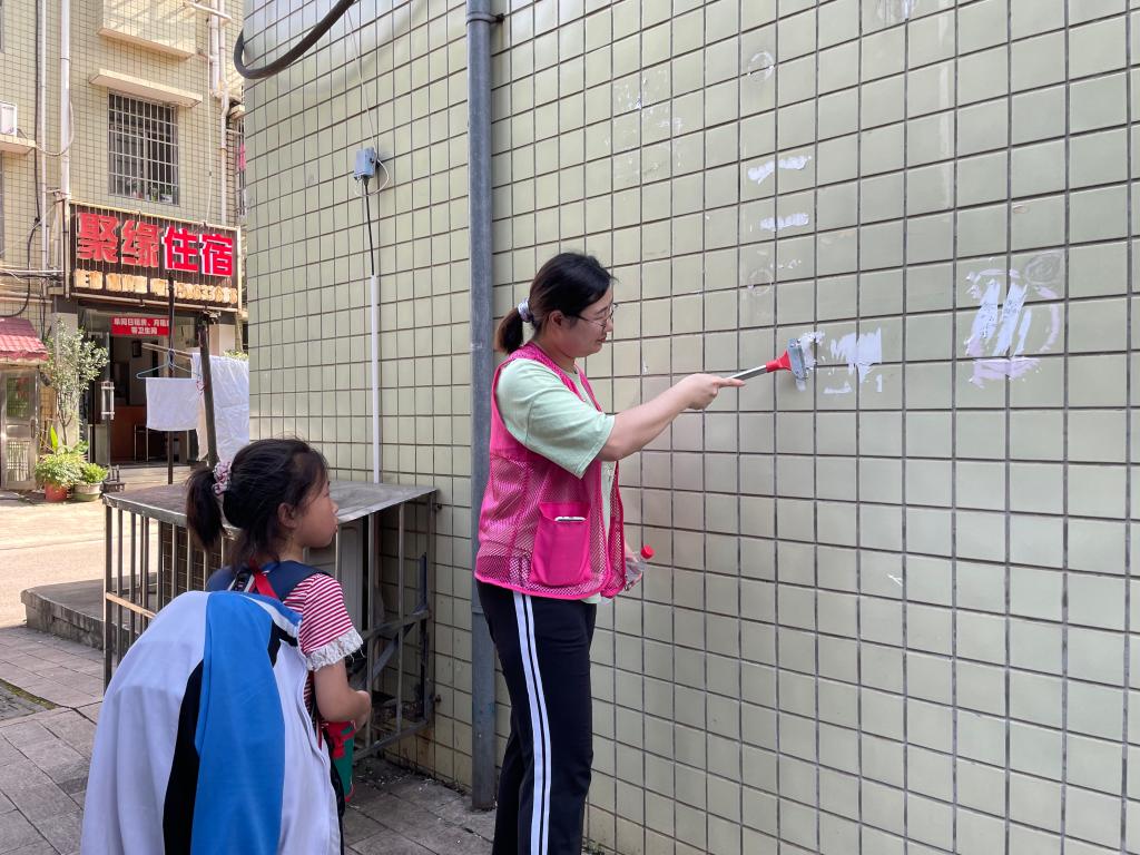 在社区负责人的安排下,志愿者分组进行相关志愿工作,对吉利社区C区的环境进行整改。进入夏季,气温很高,但志愿者们不畏酷暑,积极参与清理墙面广告牛皮癣,整洁摆放垃圾桶,劝导电动车文明摆放,帮助社区居民搬运重物等工作。在清理过程中,男生志愿者们主动帮忙清理高处广告,其他志愿者配合收集纸屑并及时清理。此次活动引来了社区居民的广泛关注,被志愿者的热情所感染,一位刚放学的三年级小女孩也加入了大家的队伍,成为了队伍里的“最年轻志愿者”。