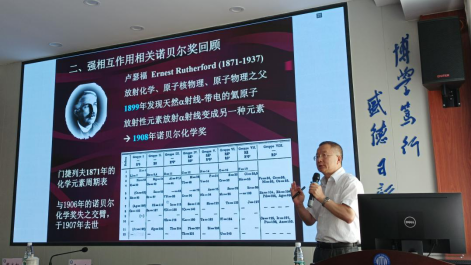 邹冰松院士以提升新一代科研青年们对于学术研究成果的了解为初心,围绕强相互作用研究的上下百余年里与诺贝尔奖丝来线去的故事主线:首先以欧内斯特·卢瑟福对于原子核物理的开创性贡献为起点,展开叙述了其后十余位诺贝尔物理/化学奖得主在强相互作用领域所发现、发明的种种里程碑式的学术研究成果。接着,邹院士阐释了强相互作用的强子结构、核素图、量子色动力学的相结构这三个基础研究前沿领域的研究情况,展望了强相互作用在核天体物理、标准模型在核物理中的检验、核技术等交叉领域的应用前景,并简单介绍了北京正负电子对撞机重大改造工程等国家重大科技基础设施的建设与发展,强调理论研究和实验研究的紧密结合促使我国在强相互作用物理领域占据重要一席之地。最后,邹院士勉励青年师生积极把握青春,不负韶华,潜心科研,勇于探索未知领域,力争取得开创性的成就。