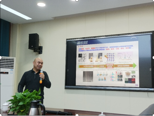 报告伊始,王教授从自身研究方向出发,简要介绍了GaN的基本物性,制备工艺发展及其重要应用。随后着重介绍了无氨化GaN纳米线制备的两种实验系统:PECVD系统和MPCVD系统。采用PECVD系统并用Au为催化剂时,可以由GaN粉末直接合成超过10微米的GaN纳米线;在较低温情况下,利用MPCVD系统可以快速生长出超过50微米且结构可调控的GaN纳米线。同时通过VLS生长气固液三相调控,还可以实现纳米线直径从六方到三角的转变。此外,王教授还分析了GaN纳米线的各种光电性能,提出可通过对GaN纳米线结构进行调控提升其场发射性能。