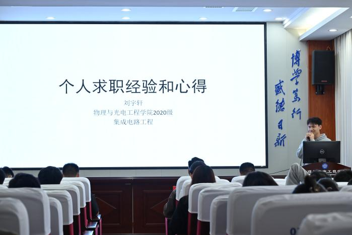 房国栋是2020级电子科学与技术专业硕士研究生,投递了80+企业的他最终入职500强企业算法岗,在会上他从薪资分布、职位类型、资源搜集、技能提升四个方面给出了求职的四大妙招。他建议同学们做好规划、瞄准目标,保持自信,提升专业技能,并为同学们找到心仪的工作加油鼓劲。