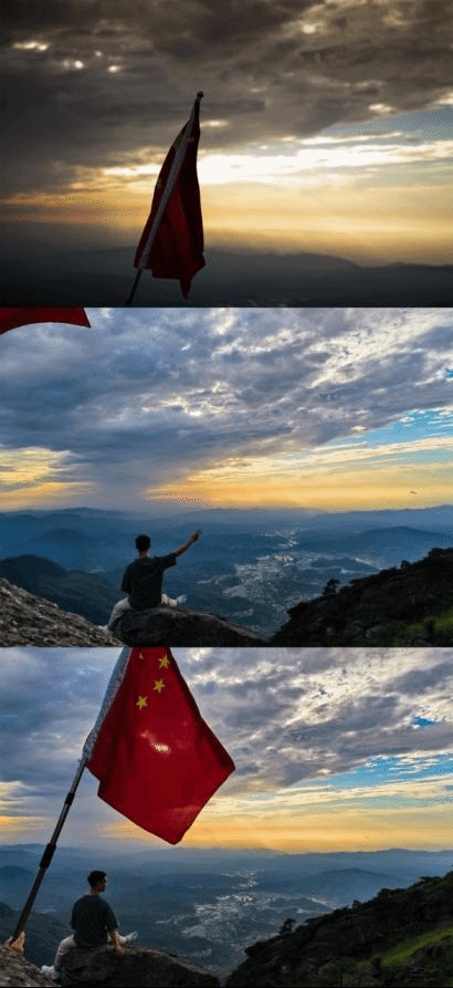面前是祖国的美景山河,身后是闪闪的五星红旗。武功山上几乎都是大学生,几乎所有的夜晚与白昼,金顶上都飘扬着五星红旗,这一面一面的红旗都是祖国新一代的青年一步一步带上去的。挥舞着的不止有青春、热血,还有欣欣向荣,国富民强。