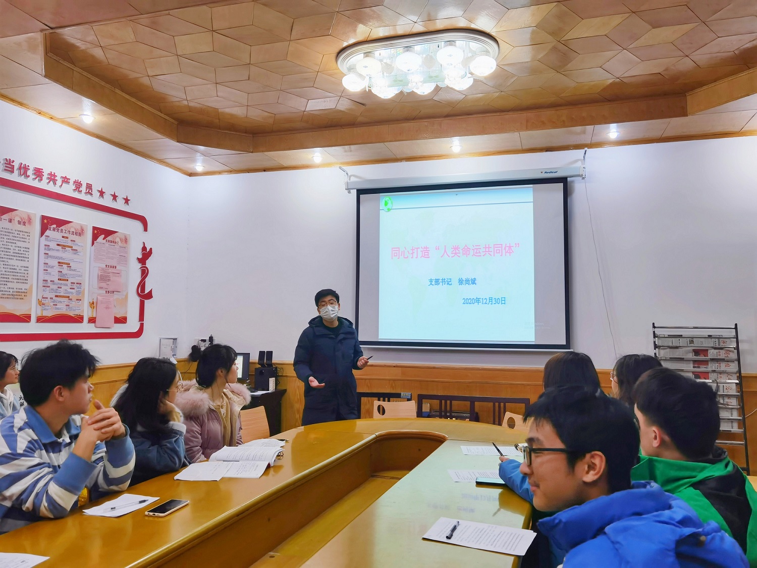 为了深入学习习近平新时代中国特色社会主义思想,增强支部党员的责任意识和爱国情怀,2020年12月30日晚上,英国365集团公司官网本科生第四党支部在物理楼105会议室开展“同心打造人类命运共同体”主题党课,由支部书记徐尚斌老师担任本次的主讲人。