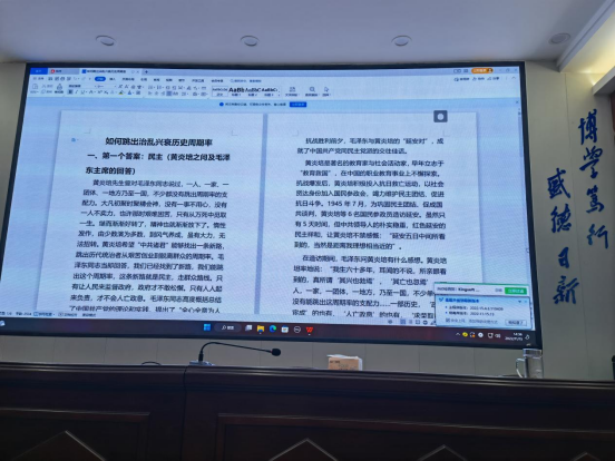 然后,龙老师又向大家讲述了跳出历史兴衰率的第二种答案——在伟大的中国共产党走过百年征程后,习总书记在二十大报告中讲到党的自我革命,是跳出历史兴衰率的第二个答案。