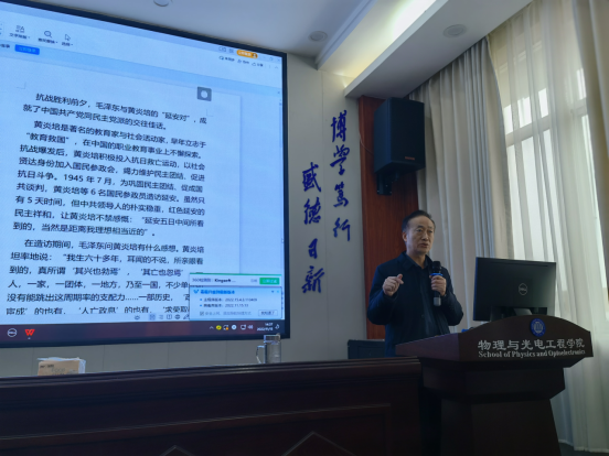 中国共产党就是在坚持着这样的民主,做到“人民至上”“江山即是人民,人民即是江山”“守江山即是守住人民的心”,坚持人民当家作主,事事为人民。“只有把每一地方的事,公之于每一地方的人,才能使地地得人,人人得事”,龙老师引用习总书记的话和黄炎培先生的话,将中国共产党的民主理念向同学做了深刻的阐释。引得台下同学们的深思,的确,共产党确实一心一意为人民服务的决心与做法,体现在社会生活的方方面面,而作为大学生党员,也应树立起以民为本的可贵精神。