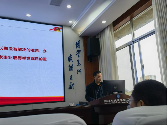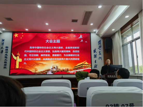 课堂总结:中国共产党第二十次全国代表大会是在全党全国各族人民迈上全面建设社会主义现代化国家新征程、向第二个百年奋斗目标进军的关键时刻召开的一次十分重要的大会。整份报告的思想总揽全局、高瞻远瞩、博大精深,是马克思主义基本原理同中国具体实际相结合、同中华优秀传统文化相结合的又一重大理论成果,通篇闪耀着马克思主义真理光芒,通篇体现着对世情国情党情的深刻洞察,极具政治动员力、思想引领力、历史穿透力、时代感召力。学习二十大精神,并用之建设祖国,是青年一代肩负的众人。希望湘大物理院党员同志在听过刘轩书记的党课后,积极进取、踔厉奋发,以实际行动投身于第二个百年奋斗目标的建设中,用自己的青春与热血去实现党和国家的宏伟蓝图。