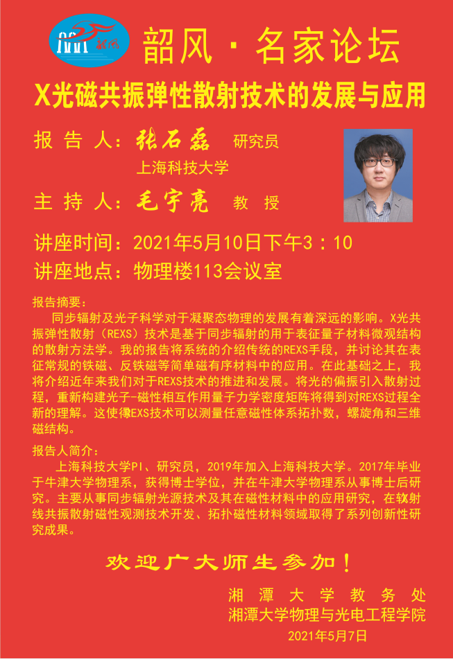 报告人:张石磊 研究员 主持人:毛宇亮 教授 时间:2021年5月10日15:10 地点:物理楼113会议室