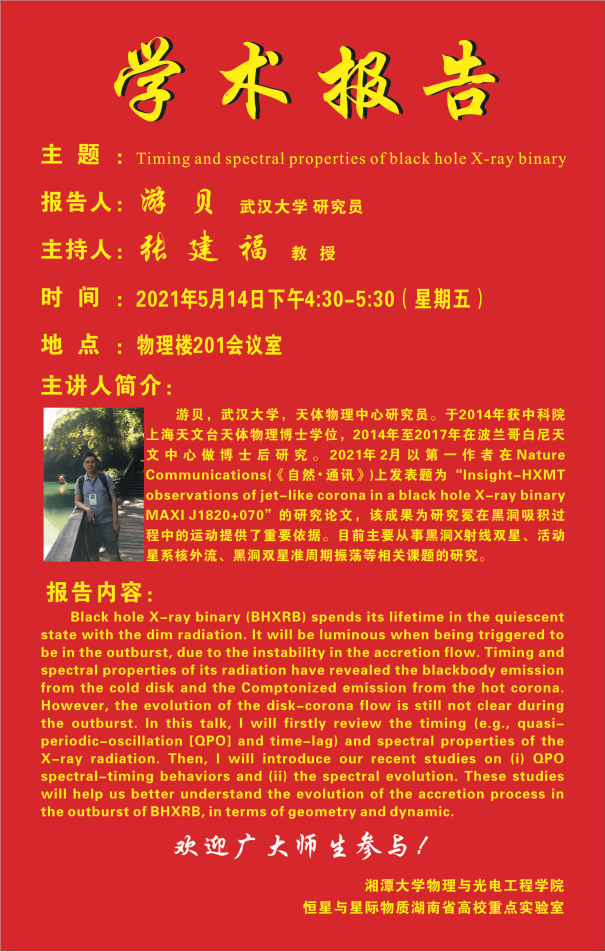 报告人:游贝 武汉大学研究员 主持人:张建福 教授 时间:2021年5月14日14:30 地点:物理楼201会议室