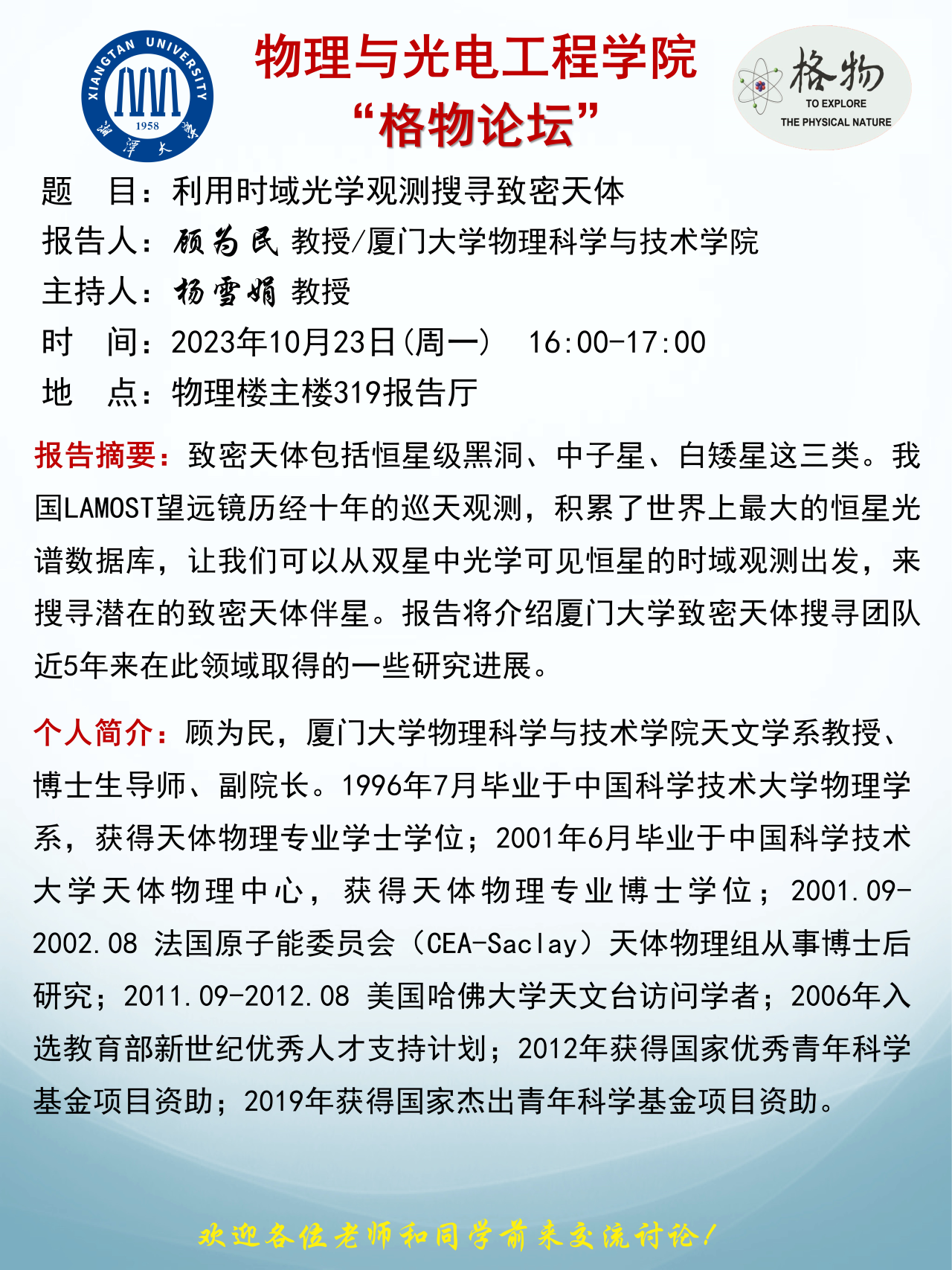 主讲人:顾为民 教授/博士生导师 厦门大学物理科学与技术学院