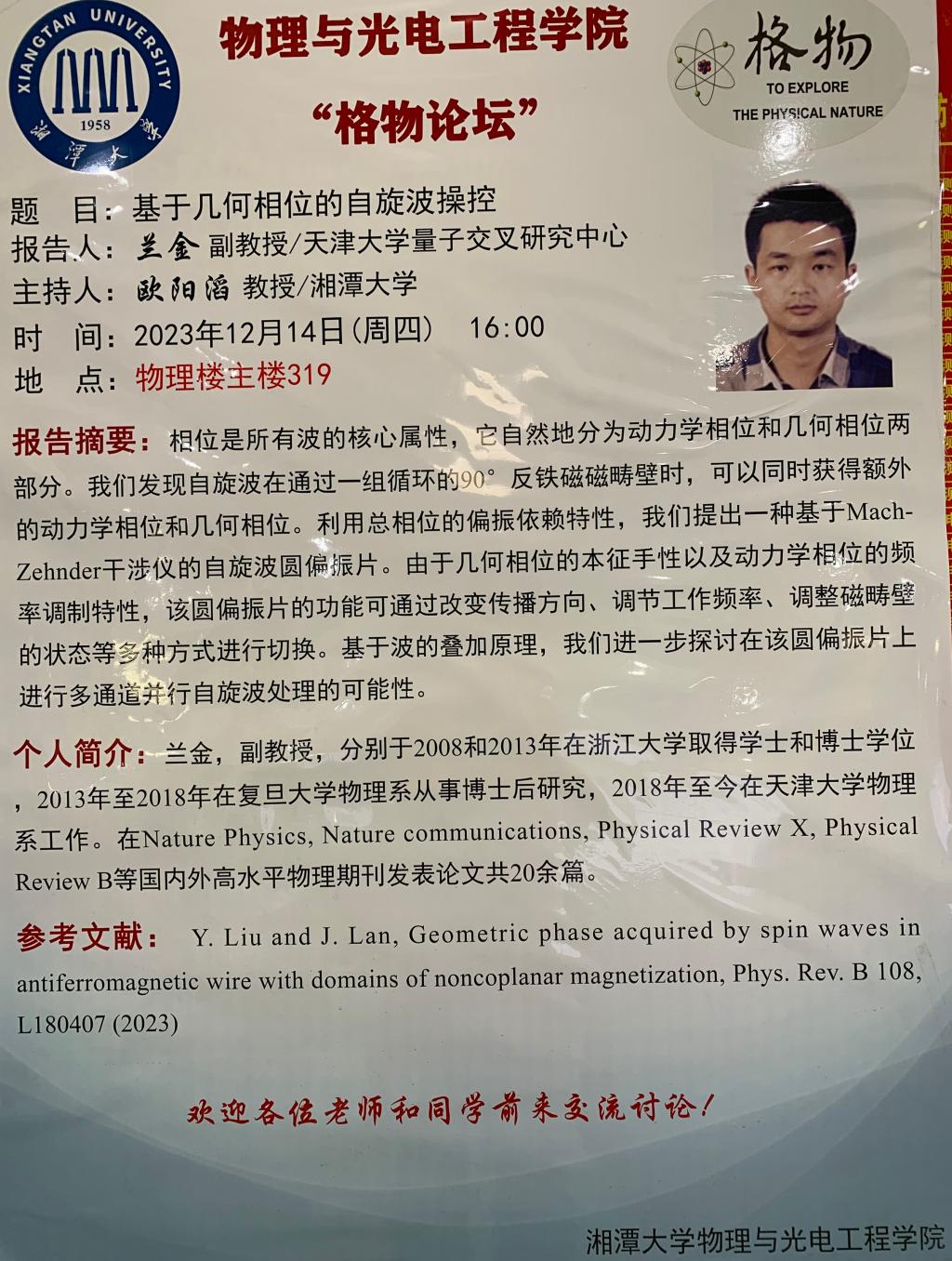 主讲人:兰金 副教授 天津大学量子交叉研究中心